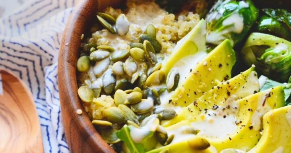 Quinoa, green beans, and kale sit alongside creamy avocado with a squeeze of lemon and a drizzle of tahini. Simple and nourishing, this bowl covers every nutritional base thanks to quinoa’s complete protein and the fiber from beans, kale, and tahini.