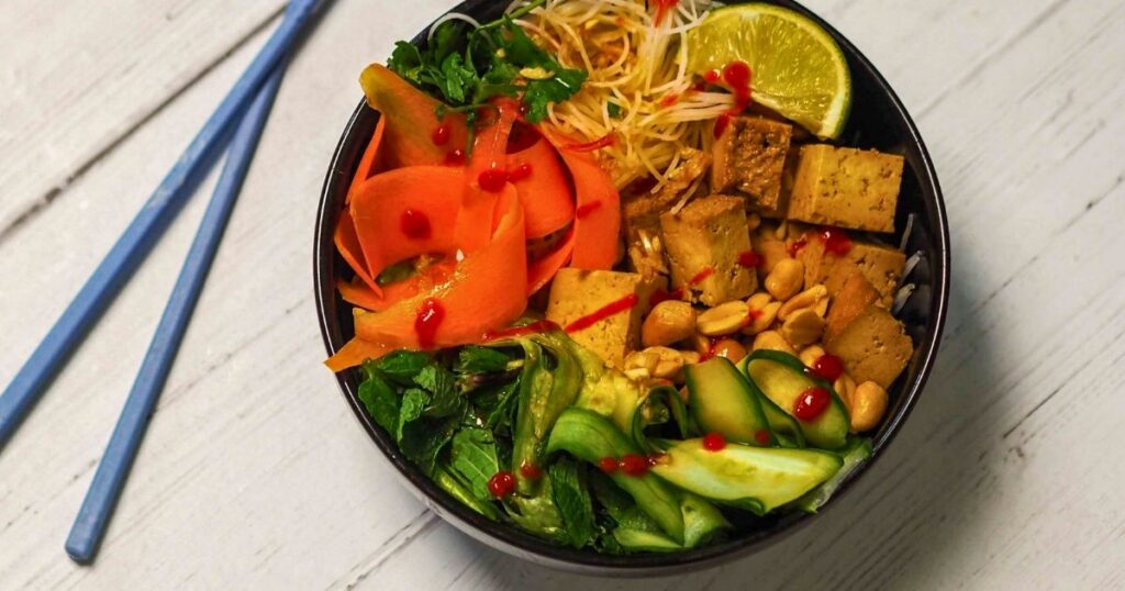 Sweet, tangy, and savory in every bite. Vermicelli noodles, fresh vegetables, and a punchy lime dressing come together with marinated tofu, crunchy peanuts, and fresh herbs for a bowl that delivers on every level.